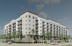 A seven-story apartment building with gated parking on the first 2 levels and 200 elegant apartments from the 3rd to 7th level.