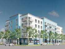 Five-story condominium building with gated parking on the 1st level and 40 private residences on levels 2 through 5.